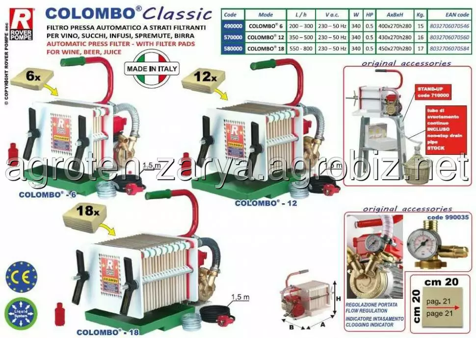 Застосування: фільтр-прес для соку, молока, сироватки, перекачування вина, виноматеріалу, пива, сусла, браги, сиропу, води, емульсії і масла.COLOMBO® FILTRO PULCINO® FILTER складається з спеціального електричного насоса і системи фільтрації, званої рідинної системою з пресованими листами. Цей конкретний тип фільтрації дозволяє отримати чудовий рівень очищення напоїв без зміни основних характеристик рідини після декантеру; з цієї причини він особливо цінується для побутової фільтрації, але також і в професійному секторі, такому як винні погреби, фармацевтичні заводи, лабораторії, пивоварні; Коротше кажучи, скрізь, де необхідно фільтрувати напій, щоб можна було подати його або розлити в пляшки абсолютно прозорими і без будь-яких слідів небажаних залишків.