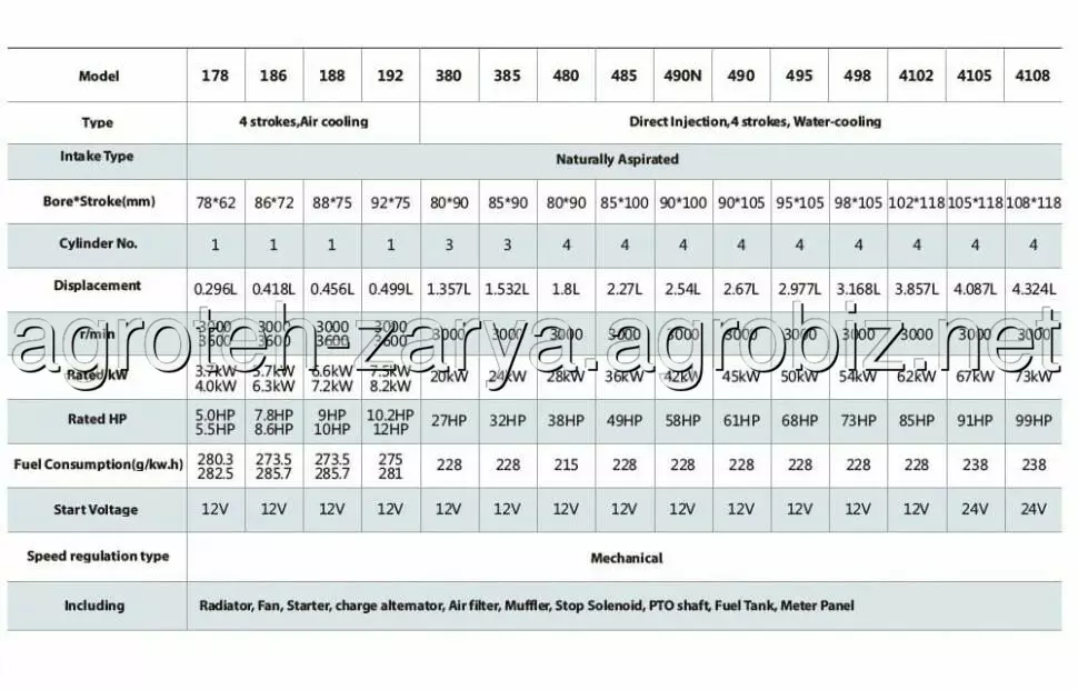Включає: Радіатор, вентилятор, стартер, генератор змінного струму, повітряний фільтр, глушник, соленоїд зупинки, вал відбору потужності, паливний бак, панель лічильника.