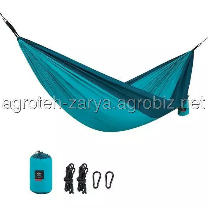Двомісний гамак блакитного кольору, виготовлений з високоміцної поліефірної емалі із закріпленими під тиском кріпленнями. Важлива перевага - висока зносостійкість. В ньому може розташовуватися декілька дітей, або двоє дорослих осіб вагою до 200 кг.