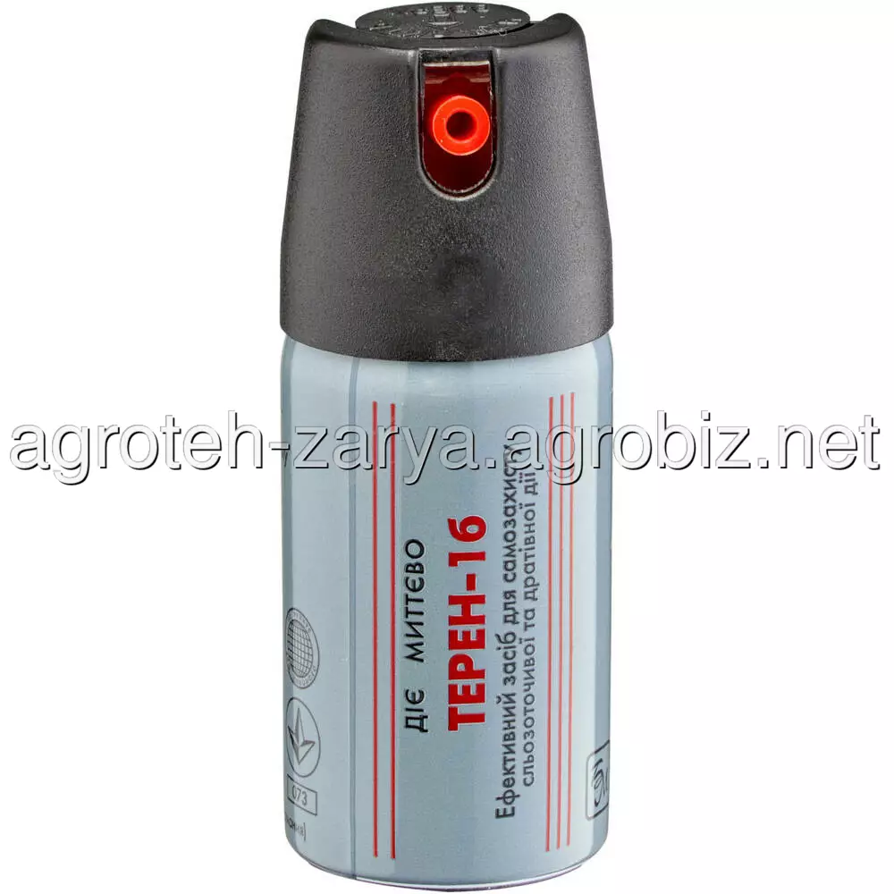 Вироби "Терен-1Б" (ТУ У 29.6-19485052-019-2002 призначені для використання цивільними особами в якості засобу самозахисту і являють собою балони аерозольного типу, заповнені препаратом, що містить речовина речовина сльозоточивої та дратівної дії (ірритант) - морфолид пеларгоновой кислоти. Препарат чинить вплив "конусом" аерозольного хмари, він ефективний при застосуванні як проти осіб, які перебувають у стані алкогольного сп'яніння, так і проти собак. Вироби є однофункціональними, невідновлювальними і неремонтованими. Застосовуваний склад не руйнує озоновий шар. Виріб сертифікований.ЗАСТОСУВАННЯ