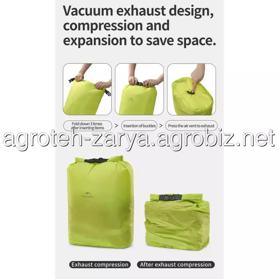 Верх згортається, як ролик, і закривається на застібку. Така конструкція не тільки перешкоджає попаданню води всередину, а й допомагає стиснути повітря для зменшення розміру виробу.