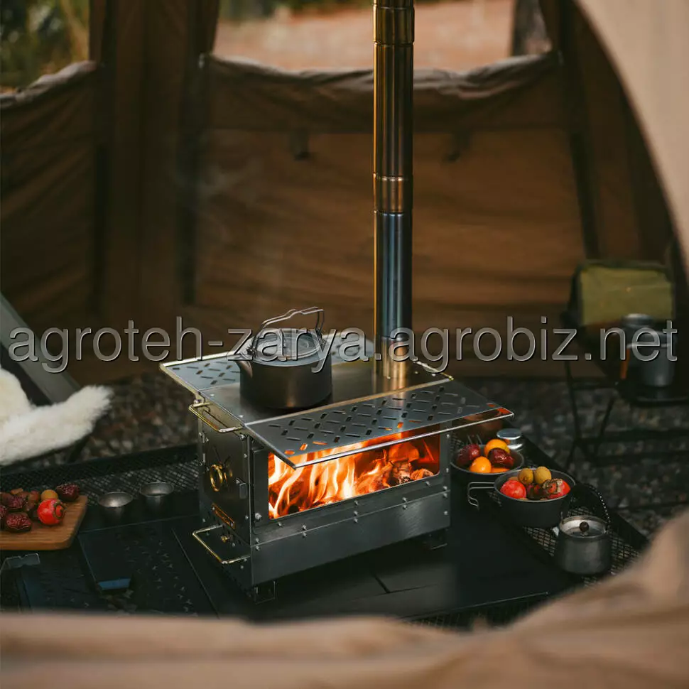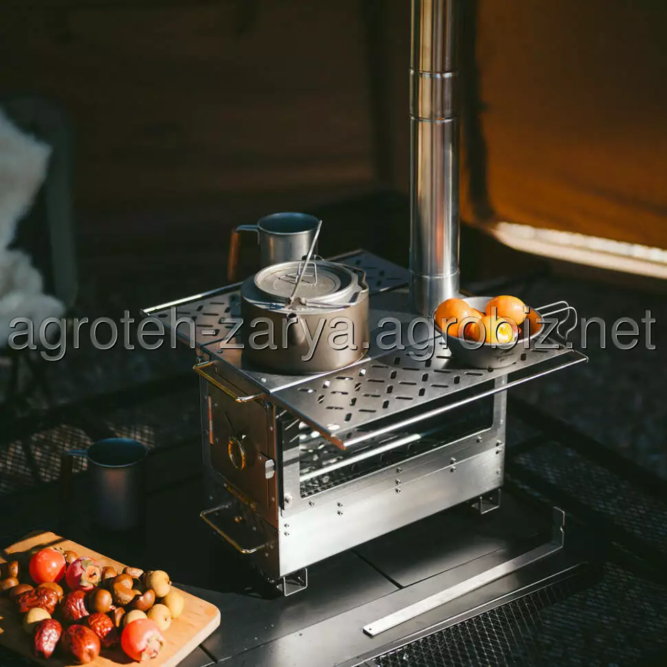 Для роботи печі використовуються дрова, які закладаються через бічні дверцята з ручкою-кільцем. На двох складаних підставках легко розмістити туристичний посуд чи харчові продукти. У такий спосіб ви можете одночасно кип'ятити воду, готувати гарячі страви та запікати овочі. Імпровізовані ручки на підставках дозволяють підвішувати дрібне приладдя, додаючи зручності під час готування та дозволяючи тримати все необхідне під рукою.