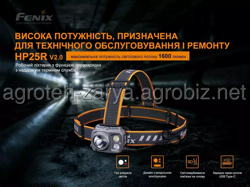 Ліхтар моделі Fenix HP25R V2. 0 є налобним варіантом. Забезпечує власнику найбільший світловий потік в 1600 люменів – дальнє світло. Ближнє світло досягає 400 люменів. Далекобійність променя при цьому становить 290 метрів. Для світіння ліхтаря використовується діод Luminus SST40, він дає біле освітлення, а також світлодіод Cree XP-G3 S4 – генерує нейтральний білий світ. Також тут застосовується діод Everlight 2835, і він дає червоний потік світла. Термін експлуатації діодів-50 тисяч годин.