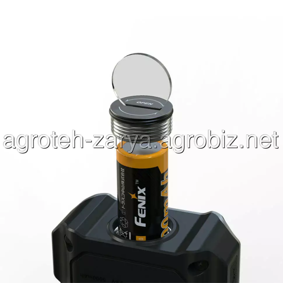 Для живлення рекомендується використовувати акумулятор Fenix ARB-L21-5000 V2.0, який забезпечує безперебійну роботу ліхтаря до 285 год на одному заряді, незалежно від умов використання. Цей акумулятор є в комплекті, як і зарядний кабель USB Type-C. Час повного заряджання займає близько 2,5 год.