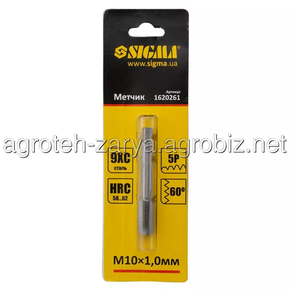 Мітчик М10×1.0мм SIGMA (1620261) призначений для нарізування внутрішніх різьблень. Являє собою гвинт з прорізаними стружковими канавками, що утворюють ріжучі кромки. Хвостовою частиною кріпиться в тримач для мітчиків (комірець), робочою частиною вводиться в отвір, в якому при провертанні тримача зворотно-поступальними рухами нарізається різьба. При нарізанні, різьблення, попередньо, змащують консистентним мастилом.