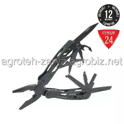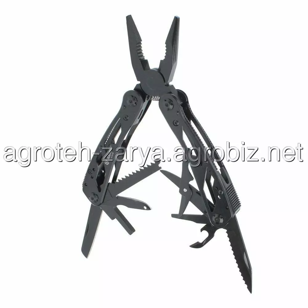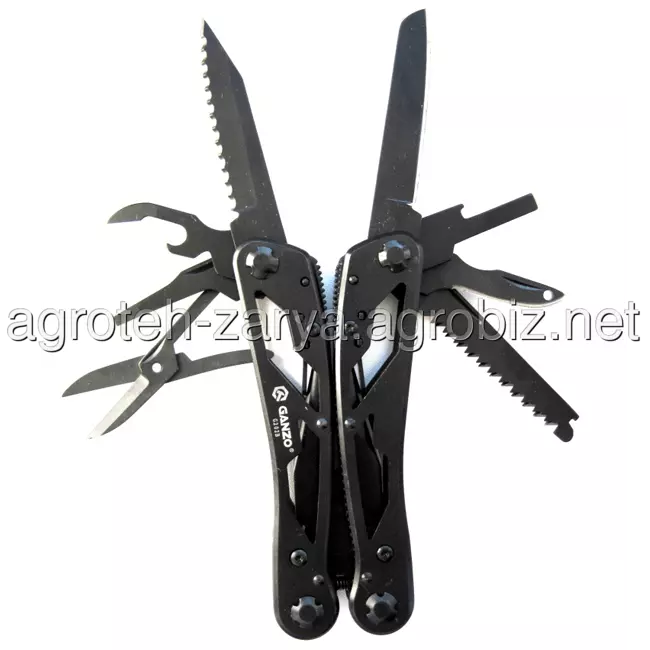 плоскогубці, кусачки, маленька викрутка плоска, ніж, серрейтор, консервний ніж, відкривачка для пляшок, для зняття ізоляції, пила, захоплення для гайо