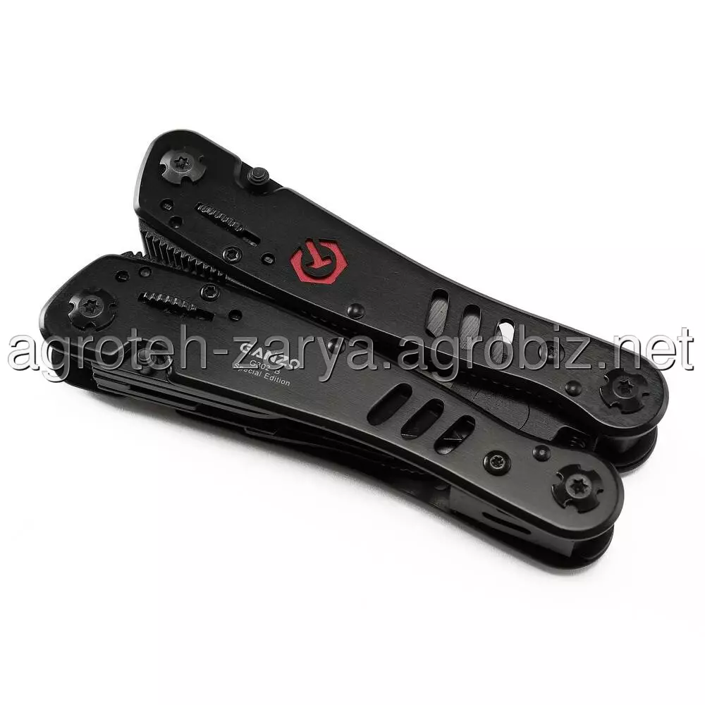 плоскогубці, кусачки, маленька викрутка плоска, ніж, серрейтор, консервний ніж, відкривачка для пляшок, для зняття ізоляції, пила, захоплення для гайо