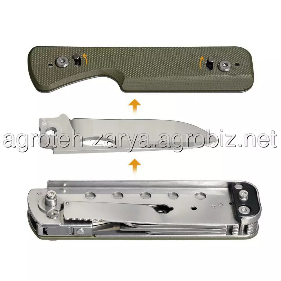 Інструменти виконані з нержавіючих марок сталі 8Cr13MoV, DIN 1.4116 та 3Cr13, які довго тримають заточування та витримують регулярні навантаження без сколів. Накладки G10 на руківʼї демонструють стійкість до вологи, температурних перепадів та хімії, а найголовніше — сприяють міцному хвату внаслідок шорсткої поверхні. Додаткові елементи та вставки виготовлені з ударостійкого ABS-пластику.