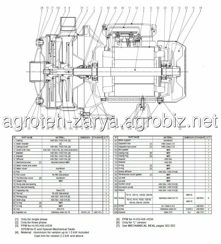 Технічні дані: продуктивність до 14,4 м3/год; висота подачі до 75 м; T.E.F.C. 2 полюсний двигун; клас ізоляції F; ступінь захисту IP 55; однофазні 220V, 50 Hz, трифазні 380V, 50 Hz; вбудований конденсатор і автоматичний захист від теплового перевантаження для однофазної версії. Для трьохфазної версії захист від теплового перевантаження повинен забезпечити споживач. Вхідний патрубок 1" 1/2 для2CDX200, 1" 1/4 для інших моделей. Вихідний патрубок 1"