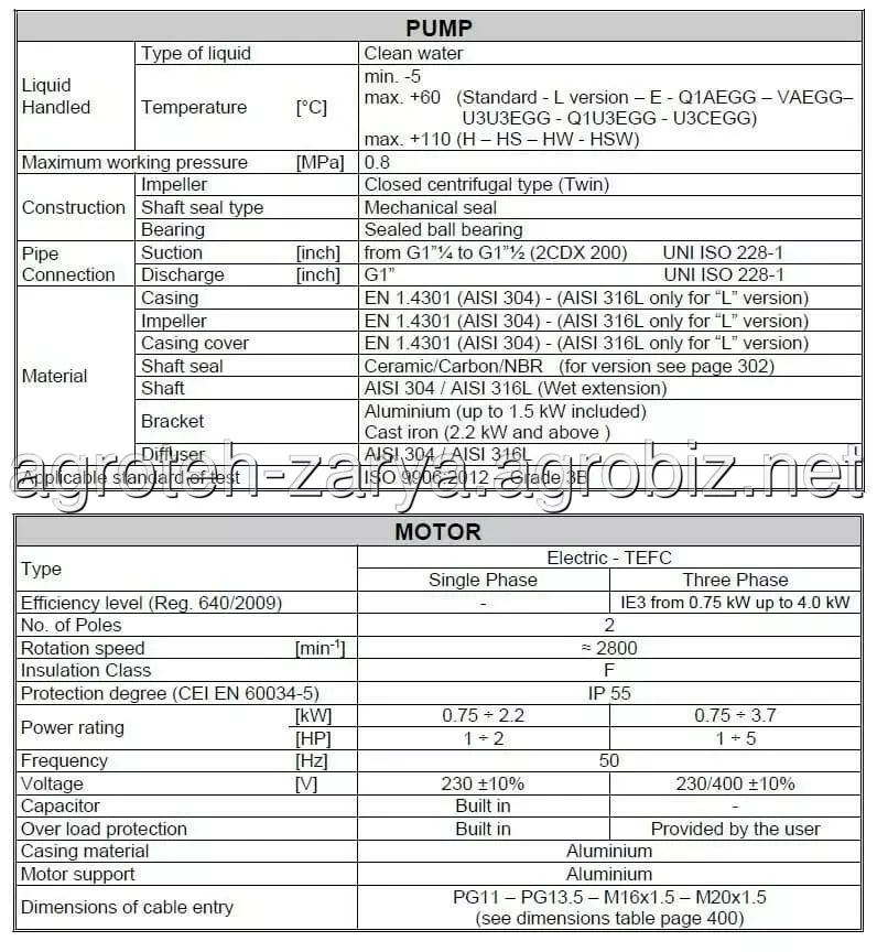 Технічні дані: продуктивність до 14,4 м3/год; висота подачі до 75 м; T.E.F.C. 2 полюсний двигун; клас ізоляції F; ступінь захисту IP 55; однофазні 220V, 50 Hz, трифазні 380V, 50 Hz; вбудований конденсатор і автоматичний захист від теплового перевантаження для однофазної версії. Для трьохфазної версії захист від теплового перевантаження повинен забезпечити споживач. Вхідний патрубок 1" 1/2 для2CDX200, 1" 1/4 для інших моделей. Вихідний патрубок 1"