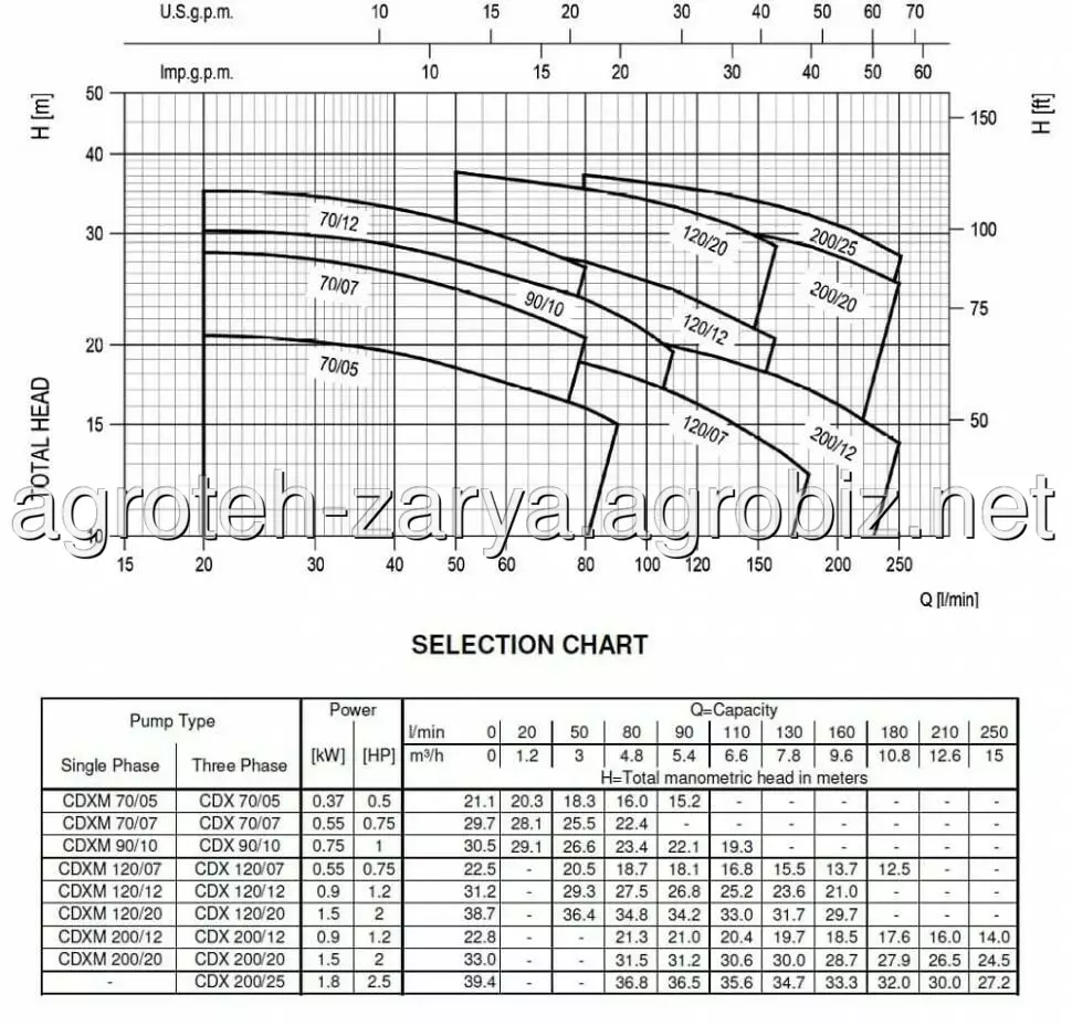 Технічні дані: продуктивність до 15 м3/год; висота подачі до 42 м; T.E.F.C. 2 полюсний двигун; клас ізоляції F; Степінь захисту IP 55; робоча напруга: однофазні 220V, 50 Hz, трифазні 380V, 50 Hz; вхідний патрубок 1" 1/2 для CDX 200, 1" 1/2 для інших моделей; вихідний патрубок 1"