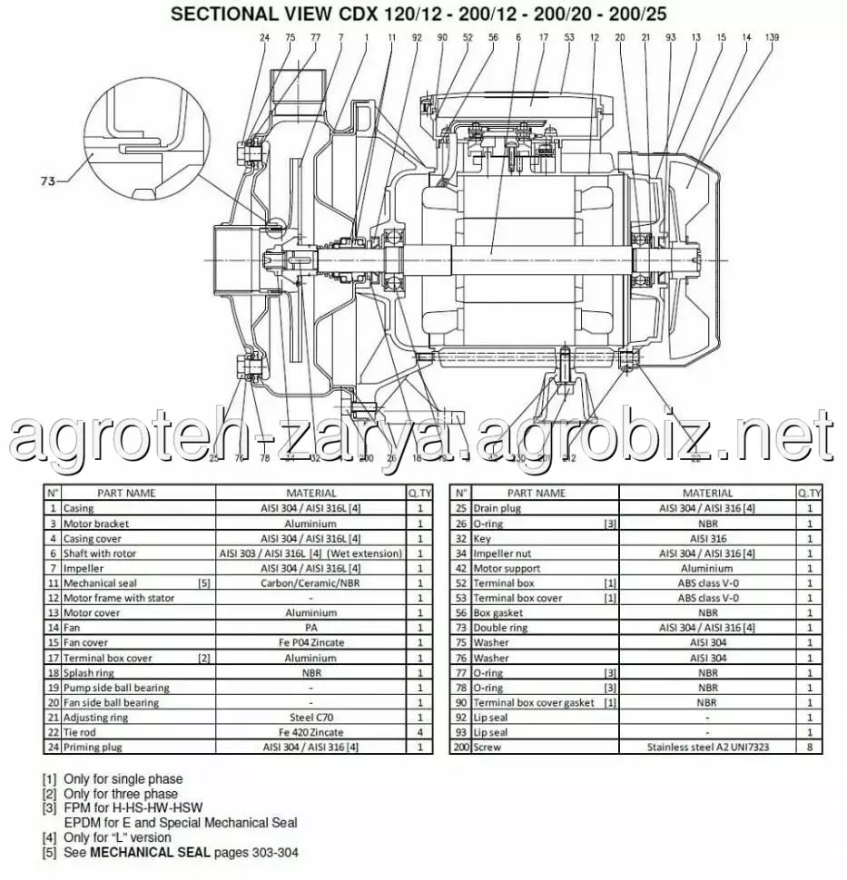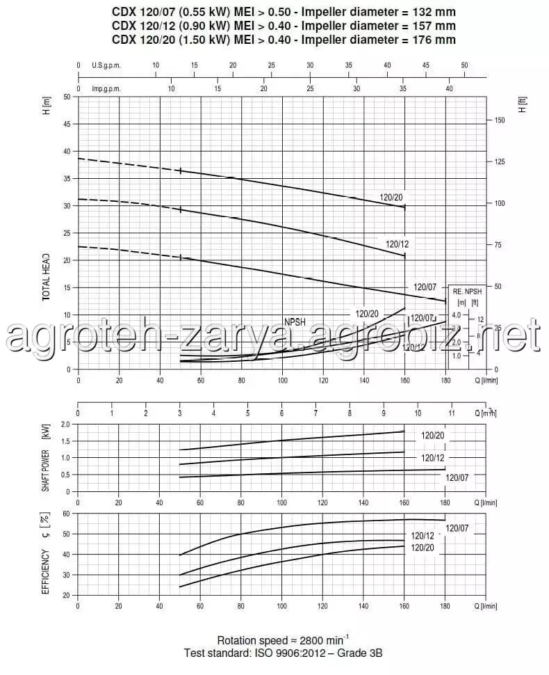 Технічні дані: продуктивність до 15 м3/год; висота подачі до 42 м; T.E.F.C. 2 полюсний двигун; клас ізоляції F; Степінь захисту IP 55; робоча напруга: однофазні 220V, 50 Hz, трифазні 380V, 50 Hz; вхідний патрубок 1" 1/2 для CDX 200, 1" 1/2 для інших моделей; вихідний патрубок 1"