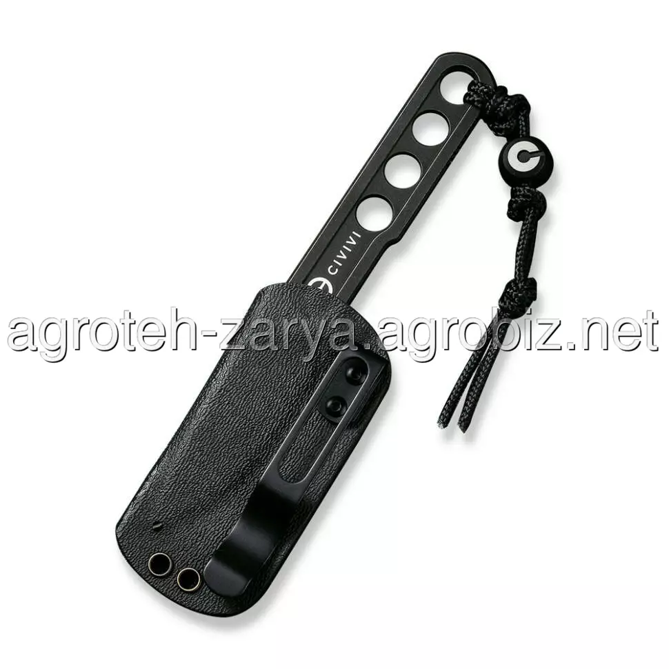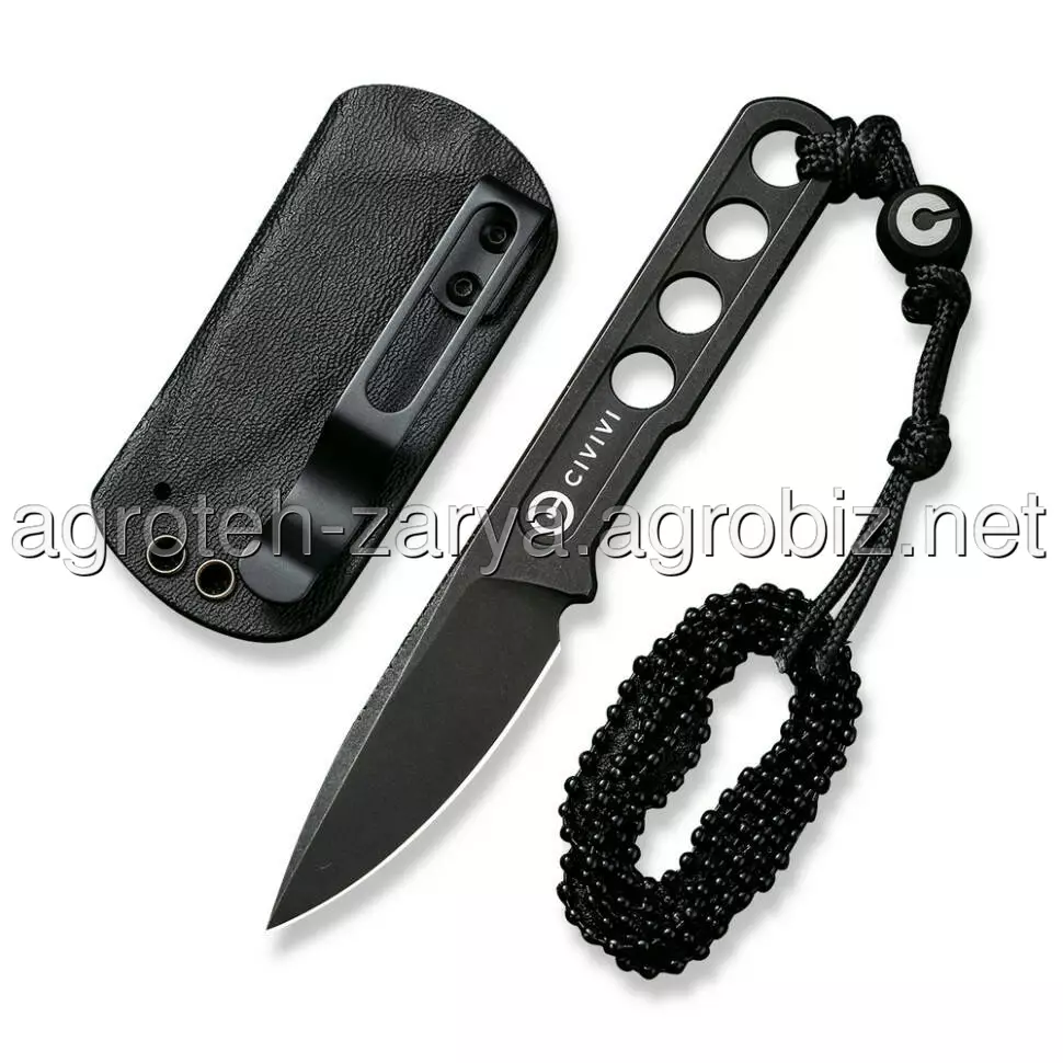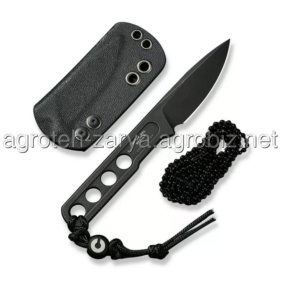 Чотири наскрізні отвори в скелетонізованій конструкції знижують вагу інструмента до 28.7 грамів, і це з урахуванням фірмового темляка з титановою бусиною, на якій видно логотип бренду. До комплекту також включений сталевий ланцюжок на шию та чорні піхви з термопластику марки Kydex, що забезпечують жорстку фіксацію ножа. У піхвах передбачено один отвір для зливу води, а також кишеньковий затискач, виготовлений з нержавіючої сталі.