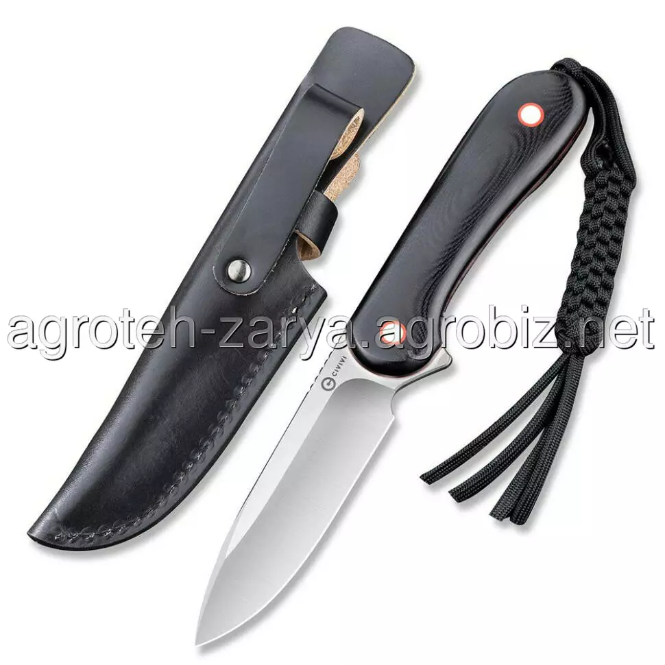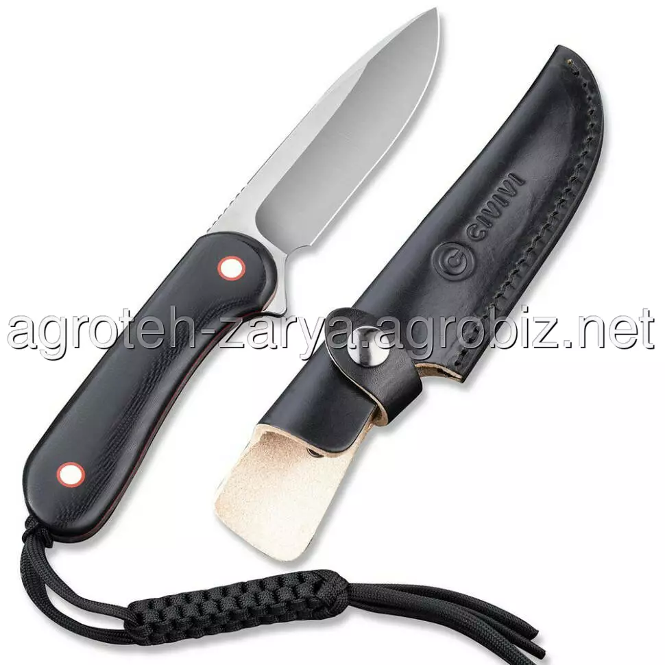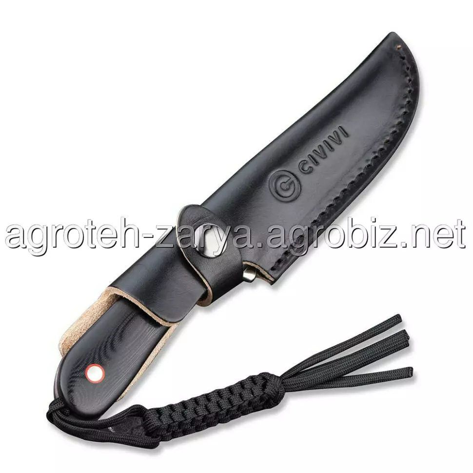 Фіксований ніж Civivi Elementum йде в комплекті з паракордом, який прикрашає дизайн конструкції. У наборі також є фірмові піхви з натуральної шкіри. Піхви застібаються на кнопку, щільно фіксуючи інструмент усередині, та оснащені петлею для кріплення на поясному ремені.