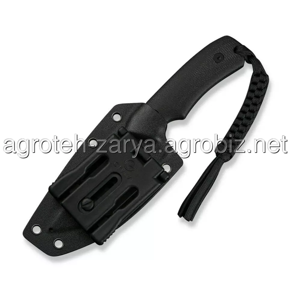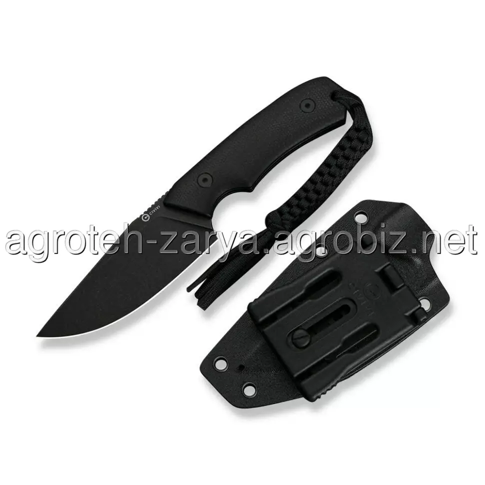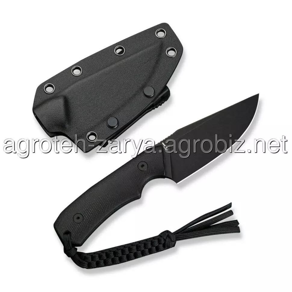 - Клинок з нержавіючої сталі Sandvik 14C28N. Це високоякісна шведська марка з високою корозійною стійкістю та твердістю 58–60 HRC. Метал легкий в обслуговуванні, а обробка методом галтування з чорним покриттям приховує відбитки пальців.