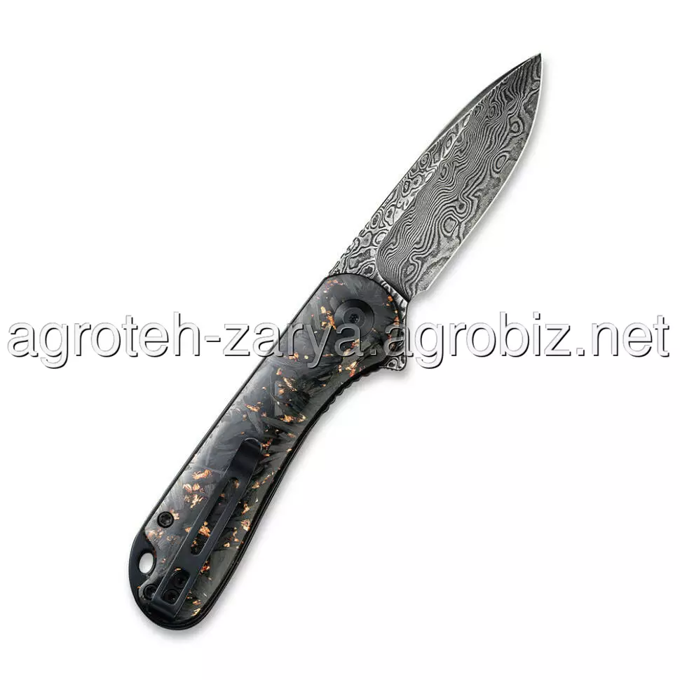 З правого боку руківʼя є чорна кліпса зі сталі. Разом з нею складаний ніж важить 77.7 г.