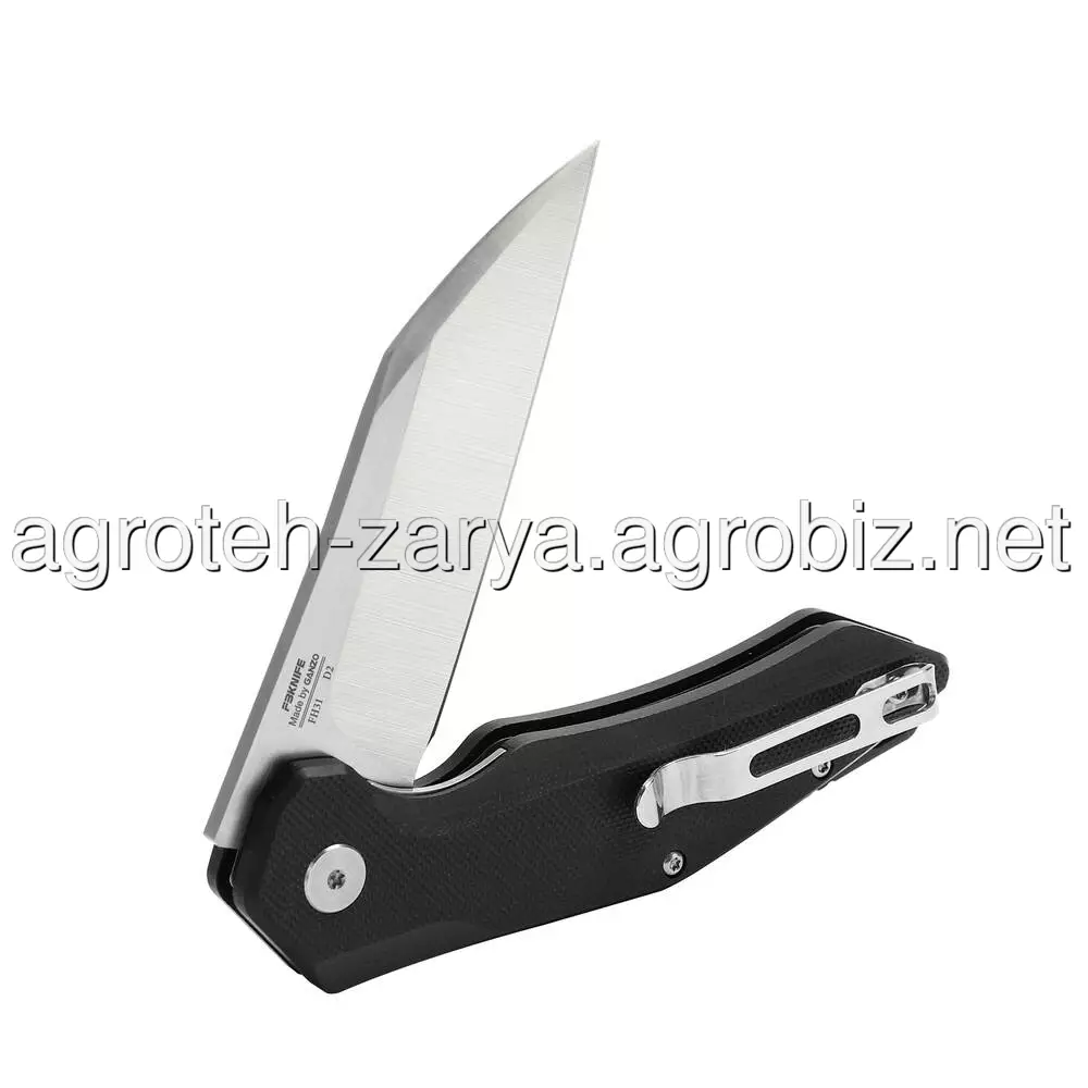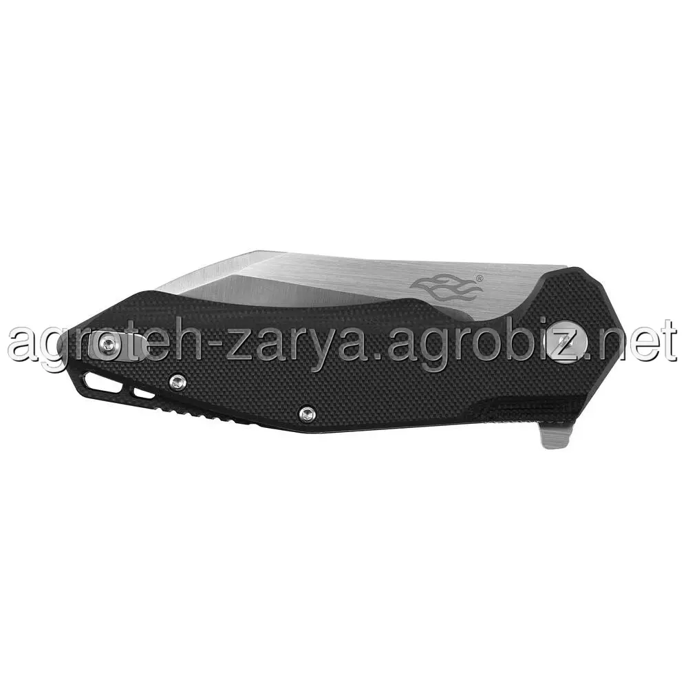 Довжина клинка цілком достатня, щоб з його допомогою було зручно виконувати всі основними різновиди робіт. Вона становить 86 мм. При цьому більшу міцність лезу гарантує товщина по обуху, рівна 3 мм. Форма клинка незвичайна для бренду Firebird - це Wharncliffe. Для такої форми характерна абсолютно пряма ріжуча кромка, наявність фальшлеза на обуху, а також гостро заточений кінчик леза. Також необхідно сказати, що поверхня ножа відшліфована методом сатинування, за рахунок чого поверхня стали нагадує атлас, на якому видно безліч ледве помітних рисок. Такі ножі менше блікують, а невеликі подряпини на їх поверхні залишаються непомітними.