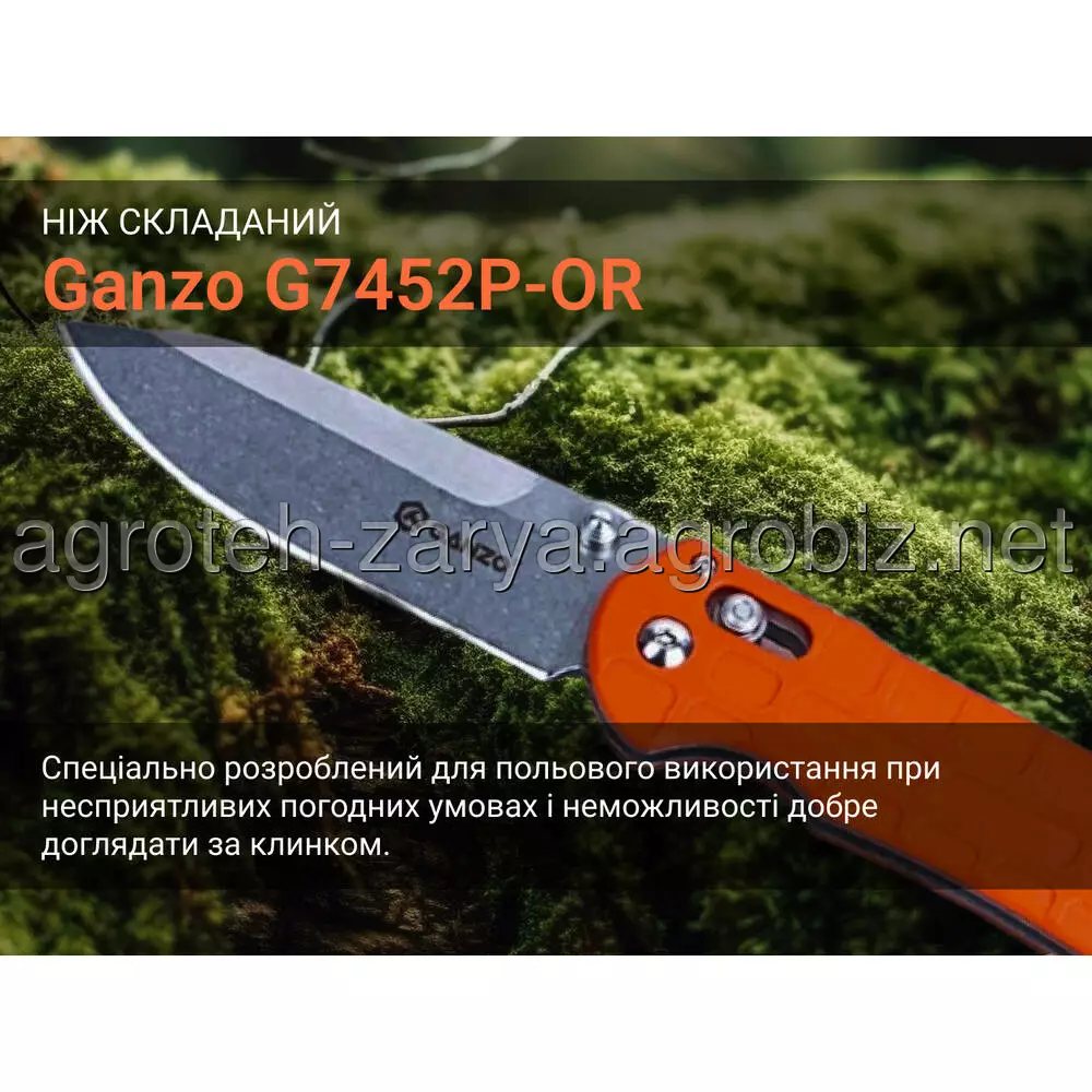 Ganzo G7452P-це сучасна модель туристичного ножа. Він розроблений з урахуванням використання в несприятливих погодних умовах і неможливості добре доглядати за клинком на природі. В якості металу для леза, виробники взяли сталь 440С.вона відноситься до категорії нержавійок, що вже говорить на користь такого металу для туристичного ножа. Крім того, дана марка відрізняється високою твердістю (58 HRC), а це дозволяє ножу зберігати заточку довше. Ріжуча кромка леза зроблена повністю рівною. Цей універсальний варіант добре підійде як для нарізки продуктів харчування, так і для переважної більшості інших матеріалів. Увагу привертає і оригінальна обробка металу. Лезо зроблено матовим, але воно не однорідно за кольором. Цей ефект дає метод Stonewash, який має на увазі шліфування абразивними каменями. Ще одна перевага методу полягає в тому, що на цьому клинку добре ховаються небажані подряпини, які можуть з'явитися після тривалого використання ножа.