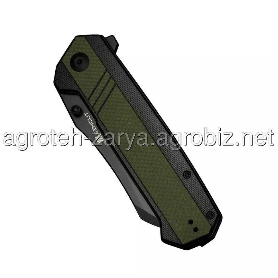 - Накладки G10 на руківʼї. Склопластик з шорсткою поверхнею не дає долоні ковзати по конструкції, підвищуючи безпеку експлуатації. До того ж G10 не боїться механічного впливу, не вбирає вологу та зберігає форму у разі перепадів температури.