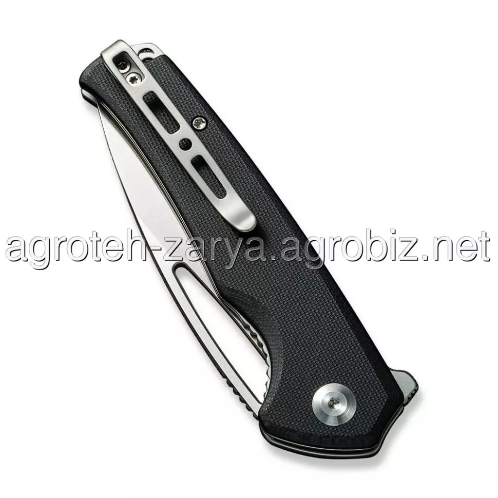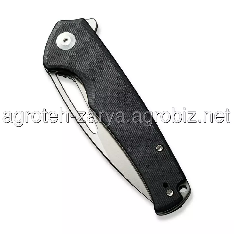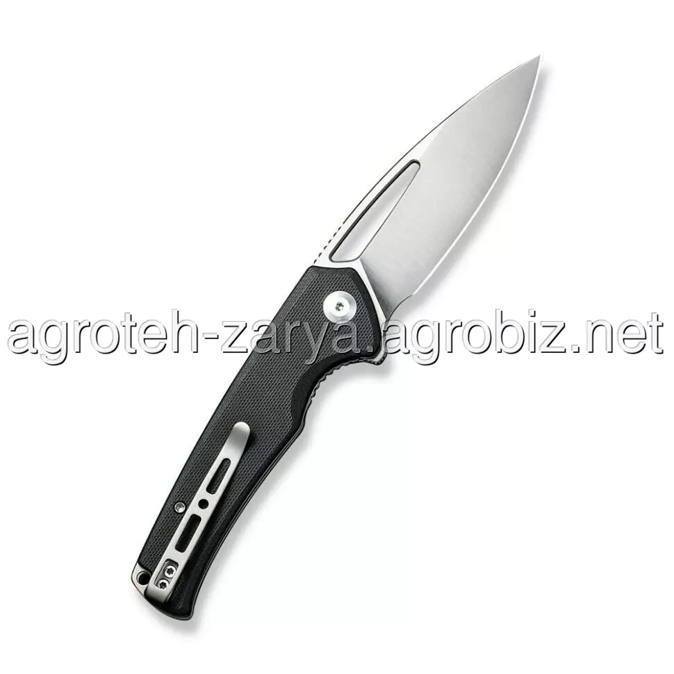 Клинок із профілем drop point підходить для різання та проколювання різних матеріалів — від харчових продуктів до натуральної деревини. Довжина клинка досягає 88.3 мм, а товщина — 3 мм. Щоб дістати його з руківʼя, потрібно натиснути на фліпер. Ще один метод відкривання пропонує наскрізний отвір у клинку, що також знижує вагу конструкції до 103.2 грамів. Лезо замикається за допомогою замку liner lock.