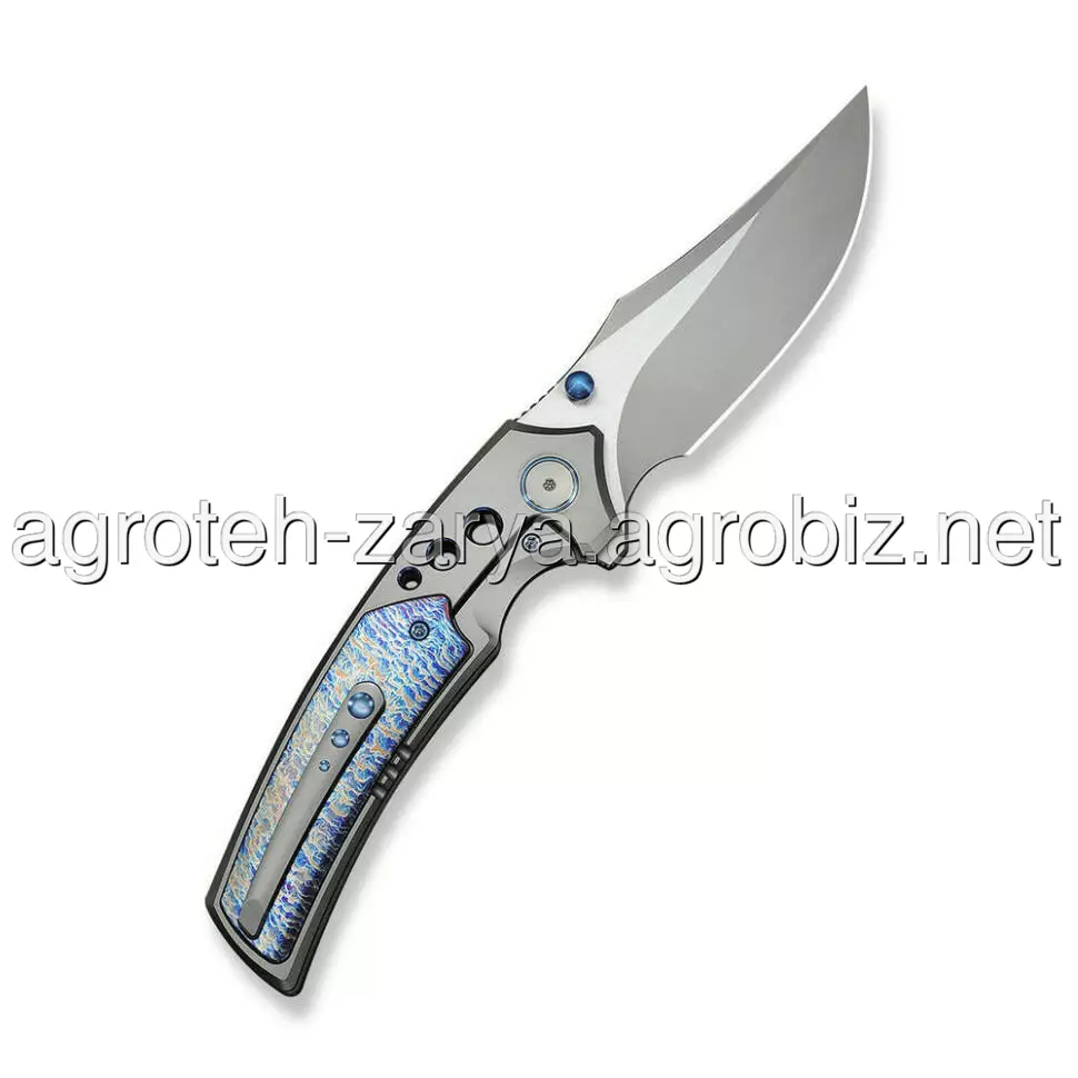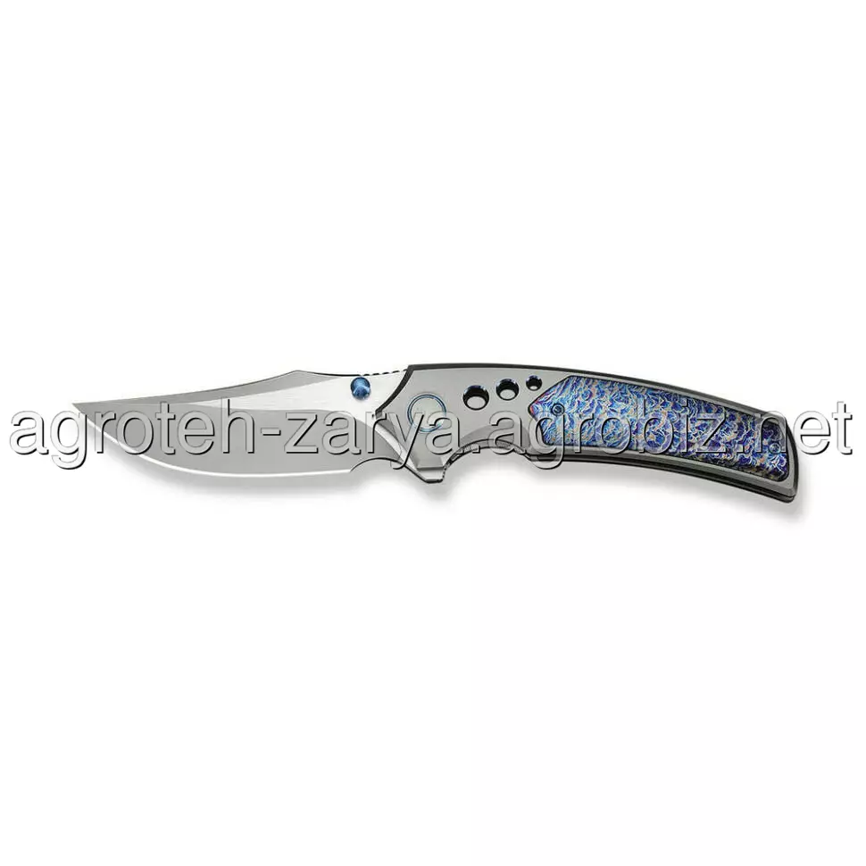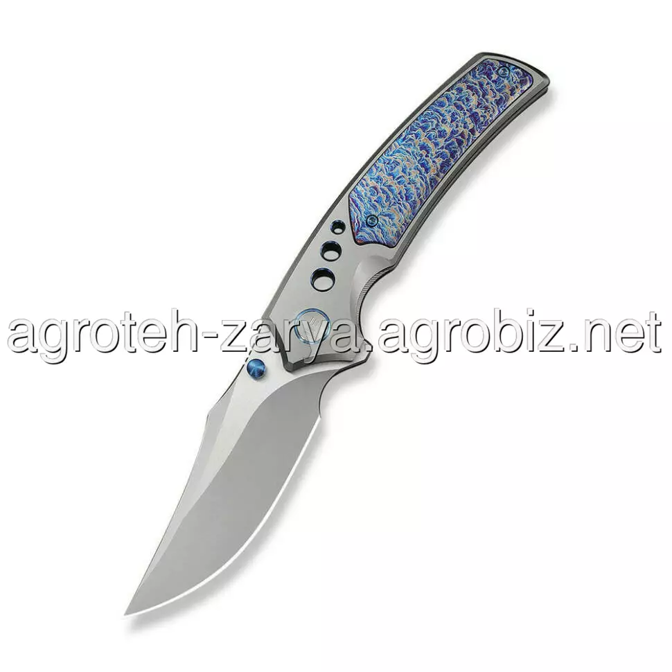 - Титанове руків’я з художньою обробкою. Повністю титанова конструкція (6AL4V) має фініш Flamed, що створює унікальні колірні переливи. Це гарантує максимальну жорсткість конструкції, стійкість до зовнішніх впливів та ексклюзивний зовнішній вигляд.