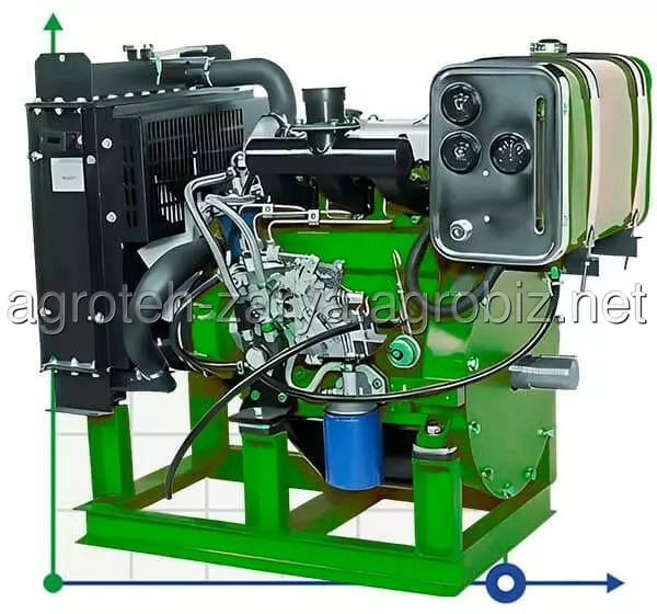 Включає: Радіатор, вентилятор, стартер, генератор змінного струму, повітряний фільтр, глушник, соленоїд зупинки, вал відбору потужності, паливний бак, панель лічильника.