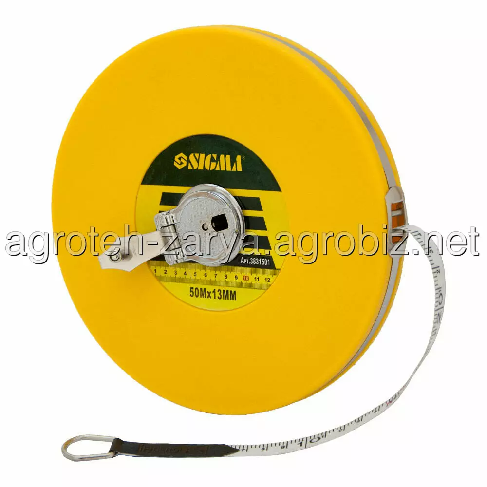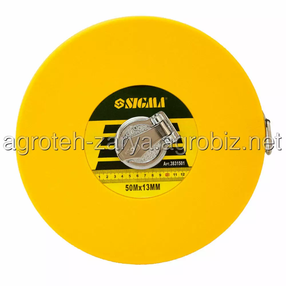 Рулетка скловолокно 50м×13мм SIGMA (3831501) - особливістю скловолоконних рулеток є можливість вимірювання великих відстаней за рахунок збільшеної міцності стрічки з низьким коефіцієнтом розтягування.