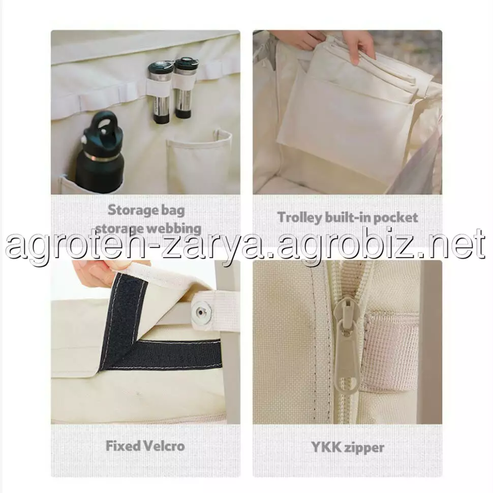Стінки візочка пошиті з тканини Оксфорд 600D бежевого відтінку, що фіксується на каркасі за допомогою контактних стрічок Velcro. Оксфорд — це синтетичний матеріал з особливим переплетенням поліестерових ниток, які наділяють тканину стійкістю до стирання, розривів і забруднень. З цього матеріалу також виконаний навіс розміром 78 х 44 х 9 см. Разом з ним висота візка складає 100 см.