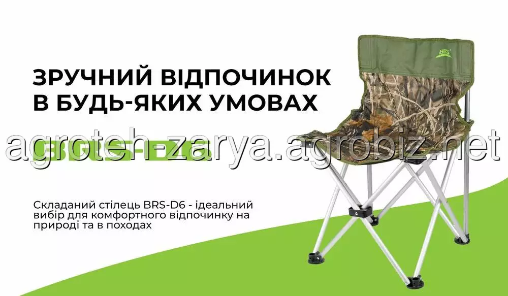 Стілець BRS-D6 відноситься до меблів складаного типу, що актуальні для експлуатації в польових умовах. Модель складається з металевого каркаса з двома парами ніжок, а також сидіння зі спинкою, зшитих із тканини Оксфорд щільністю 60D. Перевагами цього матеріалу є водонепроникність, стійкість до стирання, температурних перепадів та бруду, тому волокна не стоншуються і не тріскаються при тривалій експлуатації на свіжому повітрі, а також легко очищаються.