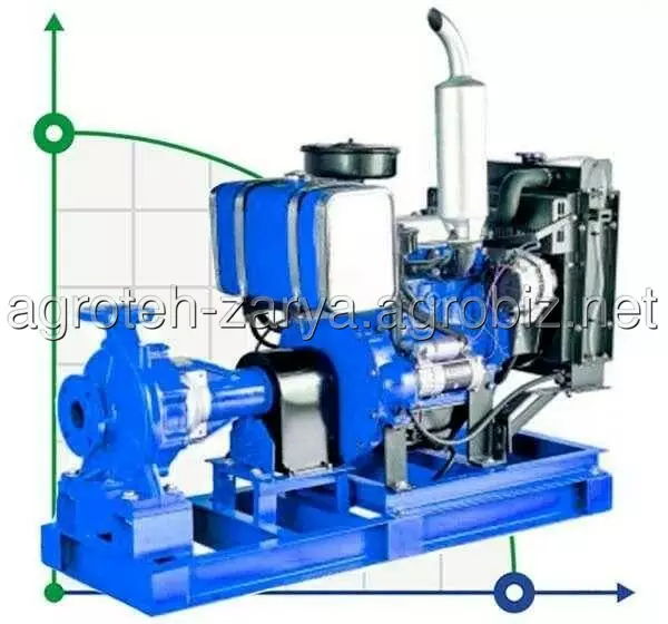 Дизельна насосна станція включає в себе: насос, дизельний двигун, радіатор, паливний бак, опорну раму, карданний вал, повітряний фільтр, пульт керування, глушник.