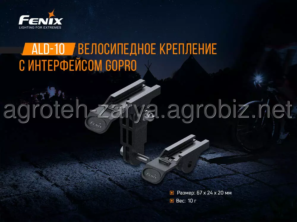 Кріплення Fenix ALD - 10 служить для фіксації ліхтаря на велосипеді. Воно оснащене інтерфейсом GoPro. Інтерфейс GoPro прекрасно поєднується з тримачем велосипедних ліхтарів, його легко зібрати. Можна застосовувати з усіма моделями велосипедних ліхтарів бренду Fenix. З додатковим знімним подовжувальним тримачем ALD - 10 сумісний з великою кількістю видів велосипедних ліхтарів. Велосипедний ліхтар можна легко закріпити буквально одним поштовхом, і він буде розташовуватися стабільно і надійно.