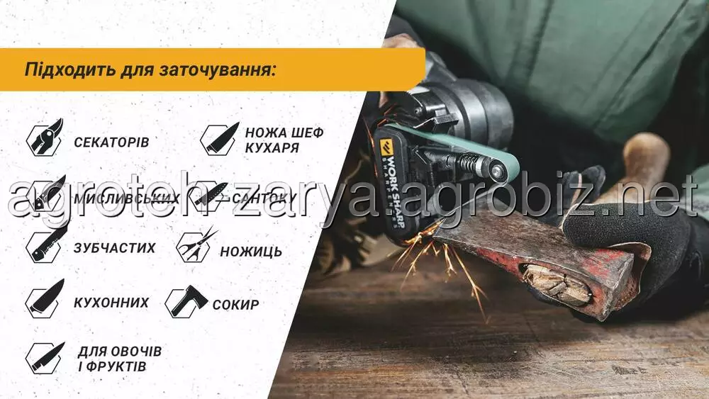 - якісно править: ножі, ножиці, сокири, леза косарок, садові ножиці, лопати і багато іншого;