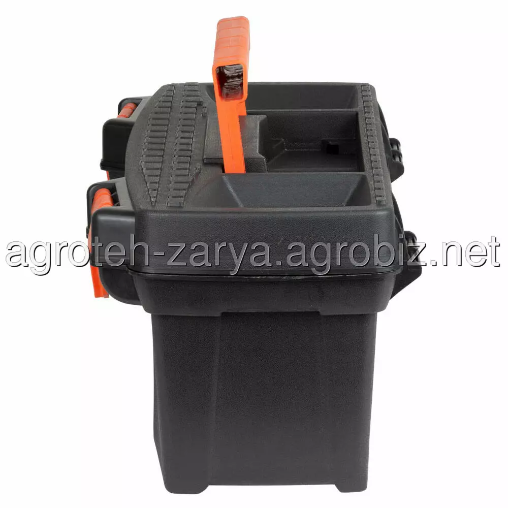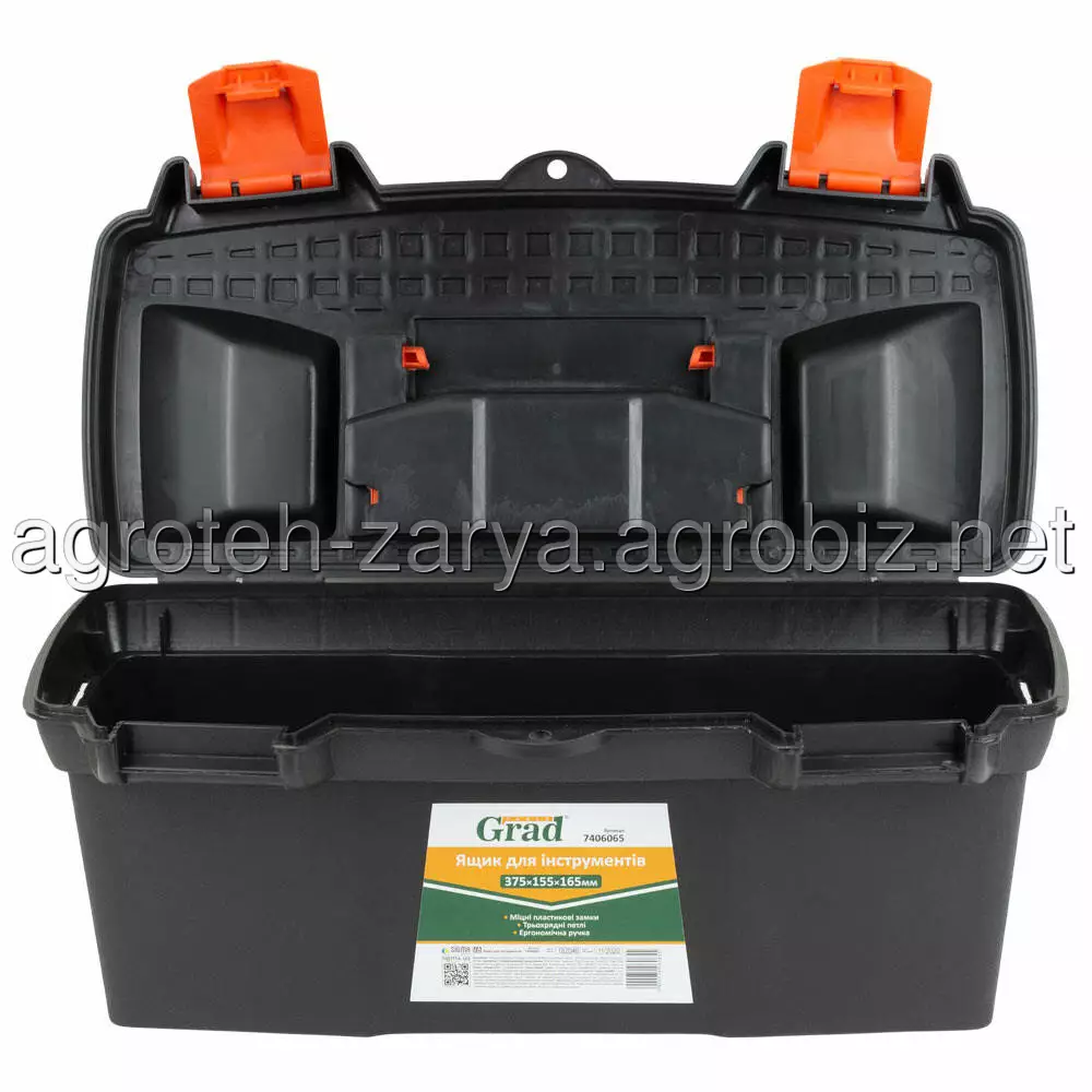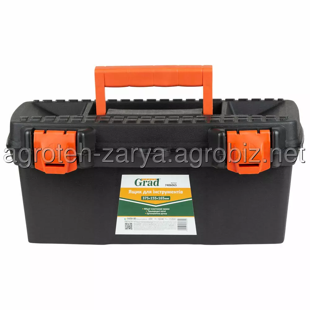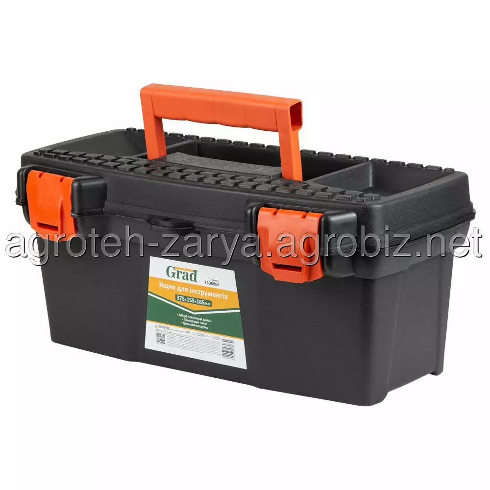 Ящик для інструменту 375×155×165мм GRAD (7406065) призначений для зберігання, транспортування, перенесення і зручного доступу до ручного інструменту. Допомагає системно організувати зберігання дрібних деталей: кріплення, шайб, гайок та інших дрібниць. Функціональний і знаходить застосування в багатьох сферах діяльності: перенесення індивідуальних інструментів, комплектація наборів інструментів і дрібних деталей для домашнього майстра, забезпечення працівників комунальних служб комплектом устаткування, укладання дрібних предметів на відпочинку - риболовлі, полюванні, рукоділлі; при комплектації необхідного набору інструментів і аксесуарів для автомобіля, майстерні, гаража або СТО, а також зберігання найрізноманітніших предметів в побуті.